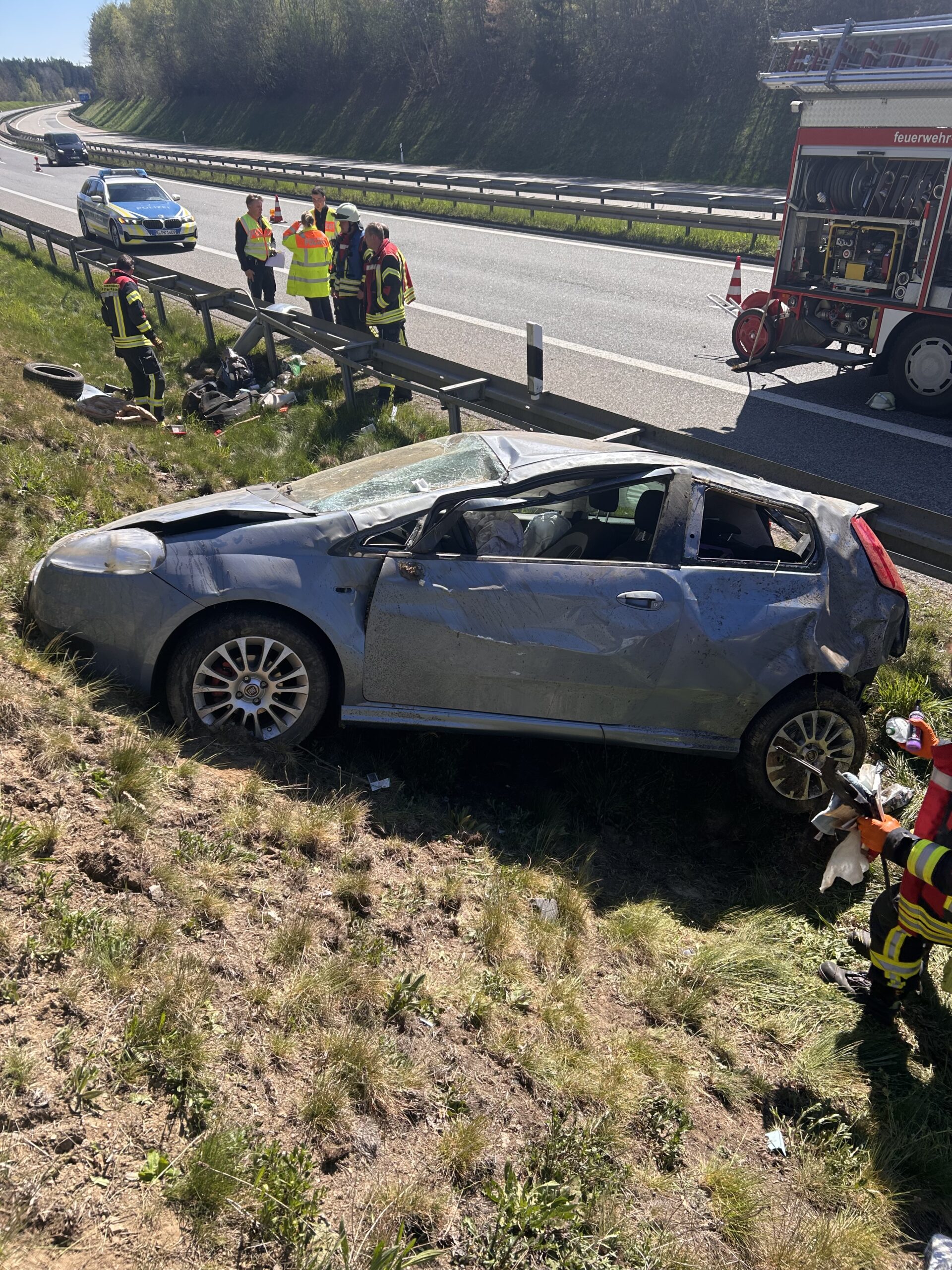Die Feuerwehr Vohenstrauß sperrte die Autobahn mittels Verkehrssicherungsanhänger vollständig ab. Unsererseits wurde das komplette Equipment für eine technische Rettung in Bereitstellung aufgebaut, musste jedoch glücklicherweise nicht eingesetzt werden, da die Fahrerin nicht im Fahrzeug eingeklemmt war. Wir sicherten das Fahrzeug gegen Wegrutschen, stellten den Brandschutz sicher und unterstützten das Rote Kreuz nach der Erstversorgung der Insassin bei der patientengerechten Rettung aus dem Fahrzeug.